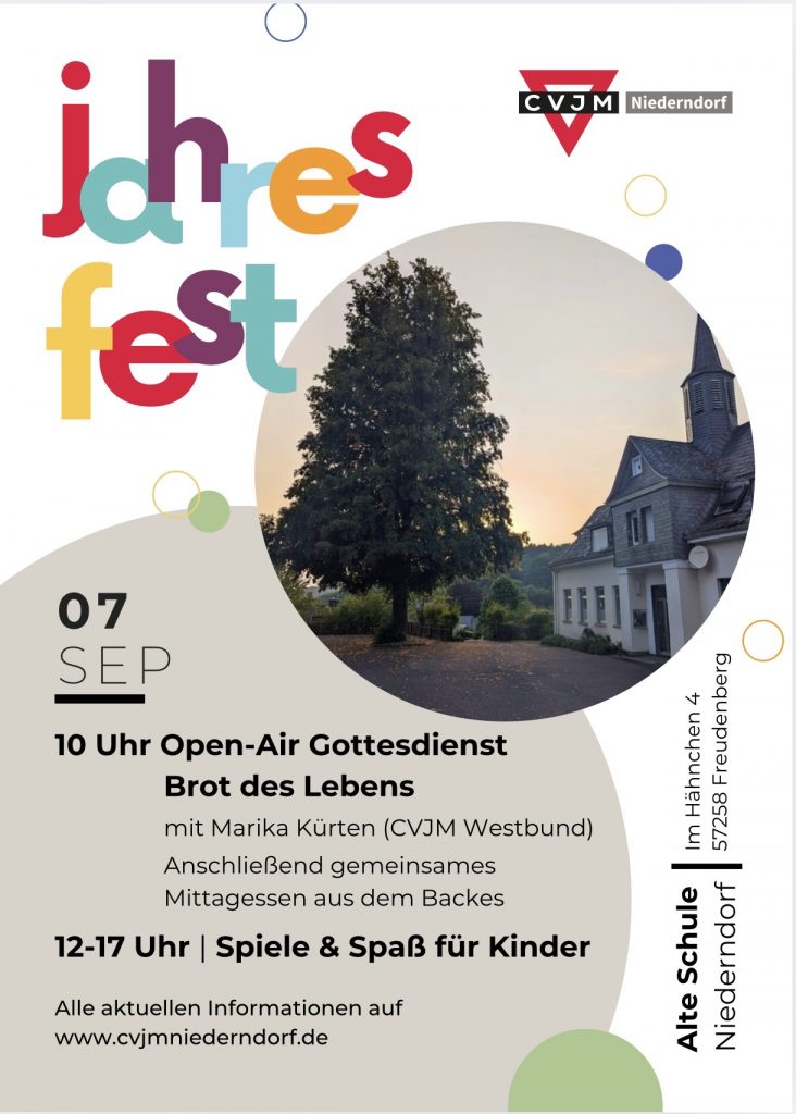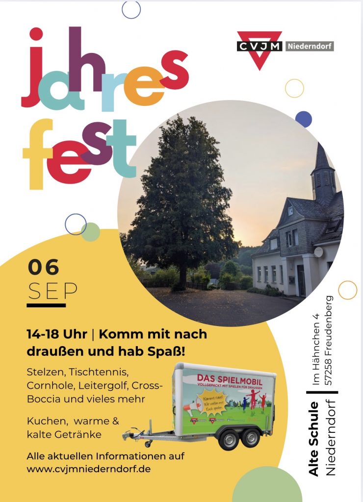 Auch in diesem Jahr wollen wir Sie/Euch wieder herzlich zum Jahresfest der christlichen Vereine in Niederndorf einladen :-). Aber neben dem traditionellen Gottesdienst (mit Abendmahl), der am Sonntag um 10 Uhr auf dem Schulplatz der Alten Schule stattfinden wird, gibt es auch schon einen Tag vorher, am Samstag und zusätzlich am Sonntag selbst nach dem Gottesdienst jeweils noch ein Angebot für die ganze Familie! Bitte beachten Sie dazu die beiden Flyer unten!